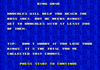 This is a hack for Sonic 3 & Knuckles for the Sega Genesis. Sonic 3 & Knuckles is Sonic the Hedgehog 3 locked onto Sonic & Knuckles. This hack adds challenges featuring various characters with various objectives. Some levels have been altered in ways such as removing all special stage ring entrances or moving bosses to other levels. Challenges include Time attack, ring grab, vandal, sidekick, gravitation, tag team, body guard, ring drain, double team, high voltage, time attack, and final battle. For detailed descriptions of what each challenge is about see the readme.Screenshots
