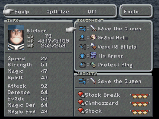 This hack allows Steiner to equip Beatrix's sword, the Save the Queen. With this, the Save the Queen sword becomes Steiner's second strongest weapon in the game, surpassing Ragnarok's Attack Power but weaker than Excalibur II's. The weapon's location, price, items required, icon, stats, abilities and damage formula were modified. The sword is available at the Black Mage Village's Synthesis Shop, but only in Disc 4.Screenshots
