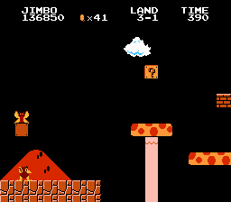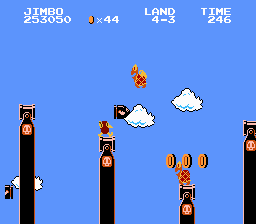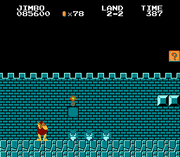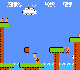Jimbo is a wacky tropical dude exploring the islands of Gitchi Goonie for his paycheck. This hack is a complete level hack of the original Super Mario Bros with some updated graphics. A few gameplay elements have been changed too (fireballs have a shorter bounce to make it easier to hit foes). This hack can be a bit of a challenge and the player starts with 9 lives.Screenshots