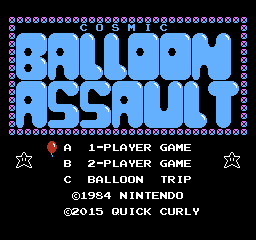 I got a chance to play Cosmic Balloon Assault today, and here are my thoughts... It's the first hack of Balloon Fight that changes the levels. I'm sure it won't be the last, since Quick Curly also posted a very detailed document explaining where all the game level data is and how to edit them. :) It's slightly harder than the original, but makes up for it by giving you many more lives. Some of the later levels have cramped spaces, but this can work to your advantage if you play it just right. Oh, and many of the graphics and palettes have changed, which is a nice touch. If you like Balloon Fight, give this one a try! (If you haven't played Balloon Fight, it's a lot like Joust). | |||
