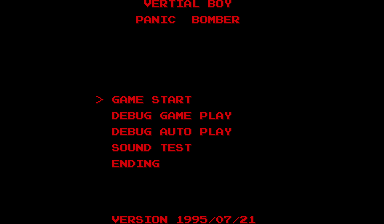 This patch for the Virtual Boy game, Panic Bomber, will restore the debug menu. When the patched ROM loads, you will see a debug menu with 5 items.