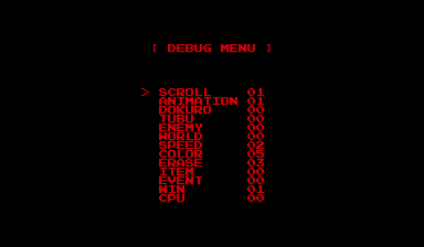 The debug sub-menus are filled with several items for you to play with. Each affects the way the game plays. They include such things as background and enemy selection.