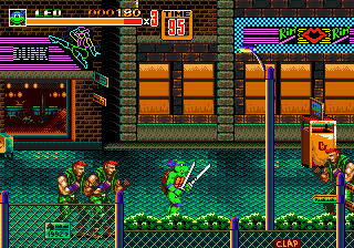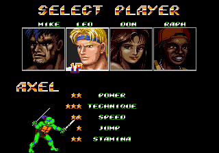 This is a hack of Streets of Rage 2 that changes all 4 playable characters with the 4 turtles of Teenage Mutant Ninja Turtles.Screenshots