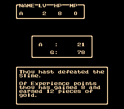 This is a hack of Dragon Warrior 2 for the NES which doubles the experience and gold earned from enemies in battle, however the game adds experience points on top of those gained from enemies, so the result is not truly double.Screenshots