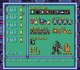 Justin went even further and replaced the password system with a full internal save/load feature. On one hand, it does away with the ability to skip straight to the last Sigma stages with full weapons and upgrades, but on the other hand, not having to jot down passwords far outweighs this, and puts it more in line with the later X games. I also feel that the first page of five data slots is plenty, but it's nice having the whopping twenty for players who can make use of it.