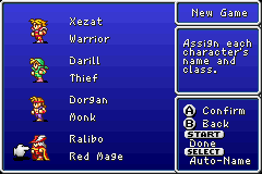 As time went on, the names used in Final Fantasy Ⅰ Advance's auto-name function--which pulls names from later games' NPCs--became outdated, with various references obsolete localizations. While it's easy to manually correct a name after it's been generated, it's more convenient for the auto-name to supply proper terms from the get-go, hence the release of this patch.Screenshots