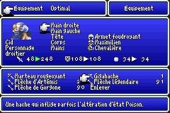 The 8×8 menu font featured in all retail releases of Final Fantasy IV Advance is far too slim. In fact, this small typeface is hard to read for some players. Dragonsbrethren's "European Font Improvement" patch sought to rectify this, but didn't alter the accented vowels or lowercase tilde n.Screenshots