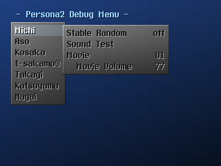 This patch re-enables the remains of a debug menu in Persona 2: Innocent Sin.Screenshots