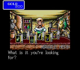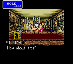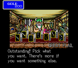 - Weapon shop: Bronze Knife, Sword, Wood Staff, Flail, Bull Whip, Long Sword, Great Flail, Steel Whip.