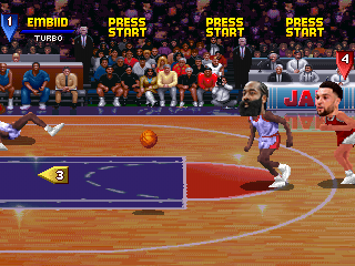 Arcade Edition. Although the PSX port looks near Arcade Perfect, there's actually a lot of subtle nuances that make it differ from the Arcade version. For instance, players take much longer to inbound the basketball. This can really slow down the pace. It looks like they made a mistake because during a goaltend the players will inbound the ball much quicker, whereas in the Arcade version, a goaltend will make players inbound the ball slower. So it's like the opposite effect.