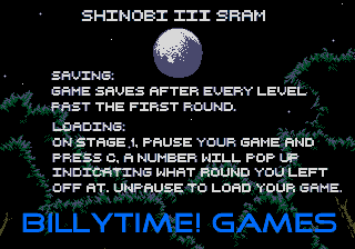 This patch is designed to add a simple saving mechanism to Shinobi III.Screenshots