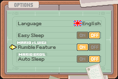 Mario & Luigi: Superstar Saga is one of the few games that rumble the Game Cube controller when played through a Game Boy Player. This patch unlocks the Game Boy Player rumble feature on GBA and adds cartridge rumble support. The original Game Boy Player rumble events are used to trigger the built-in rumble motor of any rumble flash cart, such as:Screenshots