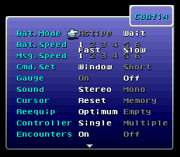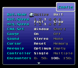 Looking for a way to make your LLG playthrough less tedious? This hack will probably interest you then! There are two hacks; one that add a config menu option to set on/off random encounters and one that add 4 options for random encounter rates (0%, 50%, 100% and 150%). There's also a third option which is the 4 options hack but with overall a 75% rate of the normal encounters in the original game. The new menu option is on the first screen of configuration at the bottom of the screen. The hack use free SRAM $7E1E1F to save the player's choice.Screenshots