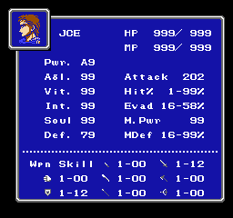 Adjusted the character stats to 999 HP/MP and 99 for the rest.