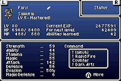 This hack takes one of the best class systems I've ever experienced and makes it even better! When I play RPGs, I don't use items, and now, I can drop that useless command forever. Class customization here is incredible, and the new order in which you receive the classes is great; getting the Dragoon so early means that you can get Lance and pair it with mages, making them a joy to use. Being able to drop the Fight command means that you can have Aim, Mug, Rapid Fire (X-Fight), or Bladeblitz without being redundant. Best of all, you get the new classes early, so they're not a complete waste of your time; Cannoneer is great early on, but by the time you'd normally get it, it's not even worth using. I also like that the equipment for each class is less restrictive; White Mages are more like clerics, now, so they can use hammers, maces, and heavy armor. It's not without its flaws, however. Galuf doesn't have unique sprites for the new classes, though that may be a limitation of the game, itself. The other thing is that there are a lot of passive abilities that don't automatically activate for classes other than Freelancer and Mime. This is a good thing in the case of something like Berserk or Undead, but ABP up and EXP up would've been nice for starters. That said, that doesn't make this hack not a vast improvement; were it not for the superior soundtrack and occasionally superior visuals, I don't think I'd ever go back to the SNES version. If you liked Maeson Mix for Final Fantasy 3, you owe it to yourself to give this one a try, and vice versa! | |||