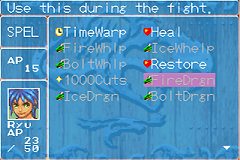 Breath of Fire 2 is another one of the author's favorite RPGs from the 1990s. The early Breath of Fire games weren't anything particularly new (character-development-wise), but they were well executed and fun to play, and definite creativity was demonstrated in different character's abilities. Every character can do something nifty to help out your team, and the party lineup can be organized differently in battle via different attack formations, which have varying affects on the attack/defense/speed of each combatant. The Breath of Fire series catapulted non-humans into central, heroic roles (Breath of Fire was the first game that the author remembers that memorably did this). And lastly, building a new town was an incredible feature, and gave the player a sense that they were really are making their own destiny and affecting the game world.Screenshots