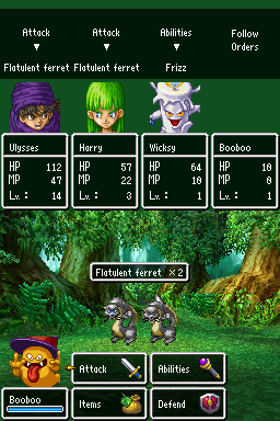Naw, this doesn't particularly make sense, but what can't be denied is how this particular element makes the game fun. It combines a cast of very nice PCs with monsters that you recruit, and in the DS version you can bring any four characters into battle at once (the SNES version only allowed three). In addition, you can travel with up to 8 humans and monsters combined, who earn experience equally. Allowing four characters makes for more party combinations, and thus makes the monster recruiting feature just that much more fun. What's more, the DS version of Dragon Quest 5 allows the player to recruit many more monsters than the SNES version!