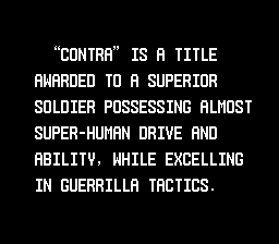 Contra, in my opinion, is one of the greatest video games ever created. Every few years, I re-visit it for a few playthroughs, and every time I do, my appreciation for the game, and the people who created it, grows. When I played with this patch, I got the sense that the people who made the patch, feel similarly. Like the creators of the game, much care and attention was put into this project. It is evident. Just the fact that they did it, considering the following paragraph, speaks to this. As does the accompanying 'readme' file. The Japanese version of Contra isn't drastically different from the US version. There are a few minor graphical 'upgrades', and in between levels, there are little sort-of cut-scenes with dialog, and a progress map. Nothing major, but it adds to the game. In this patch, you get all this, with the Japanese translated to English. I don't speak Japanese, but the resulting English is clear, makes sense, and has proper grammar. So that's perhaps a sign that the translators knew what they were doing. In addition, at the title screen, the "Contra" logo has been given some animation. I don't know if this was in the original Japanese version of Contra (I don't think it was), or if it is original to this hack, or a previous one, but in any event, it is cool. A nice little touch. Thank you for this patch, and for doing a great job on it. | |||