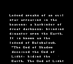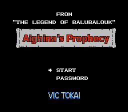 This is a 100% English translation of Aigiina no Yogen - From The Legend of Balubalouk. The introduction, title screen, password system and all non-player character dialogue has been translated, and the originally English ending has been corrected to fix errors in spelling, vocabulary and grammar.Screenshots
