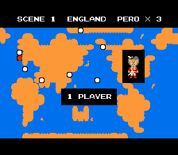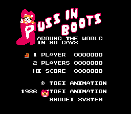 This is a 100% English translation of Nagagutsu wo Haita Neko - Sekai Isshuu 80 Nichi Daibouken for the Famicom (NES). The only Japanese text present in the game is the title screen and a kanji in-game that represents 'day'. Both of these were translated (the new title is Puss In Boots - Around The World In 80 Days), and some English spelling errors in the game were also corrected.Screenshots