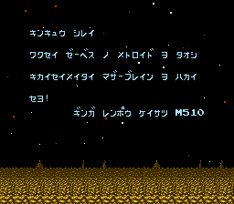 This is an NES/Famicom Japanese Translation for Metroid. Just patch this to the following rom, Metroid (U) [!]Screenshots