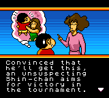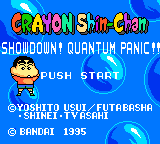 This is a 100% English translation of Crayon Shin-Chan - Taiketsu! Kantamu Panikku!! - translated as Crayon Shin-chan Showdown! Quantum Panic!! - for the Sega Game Gear. All Japanese text has been translated into English - the only exception being a few signs in the background of the story mode, which add nothing to either the gameplay or the story.Screenshots