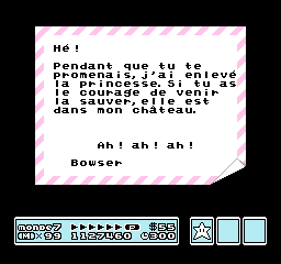 EN: A French translation of Super Mario Bros. 3 with almost all identical texts to the GBA version (Super Mario Advance 4: Super Mario Bros. 3).Screenshots