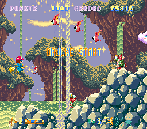 Märchen Adventure Cotton 100% is a lovely and rather short game that reminds me in several points of Parodius Nonsense-Fantasy for the SNES - however with a much harder gameplay. Here you're flying on your magical broom through different levels where you've got to defeat all different types of enemies and bosses. By collecting items (which the enemies leave behind) you can power up your 'weapon' and abilities which are going to help you getting your stolen candy back. The text within the game isn't all too much but still the game's a lot of fun if you wanna play something different to Parodius or Pop'n Twinbee. | |||