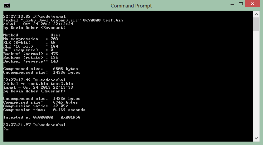 exhal and inhal are portable command-line tools designed to decompress and recompress/insert data used by several NES, SNES and Game Boy games developed by HAL Laboratory. Files compressed using exhal can often be smaller than their original compressed forms in the source ROMs.Reviews