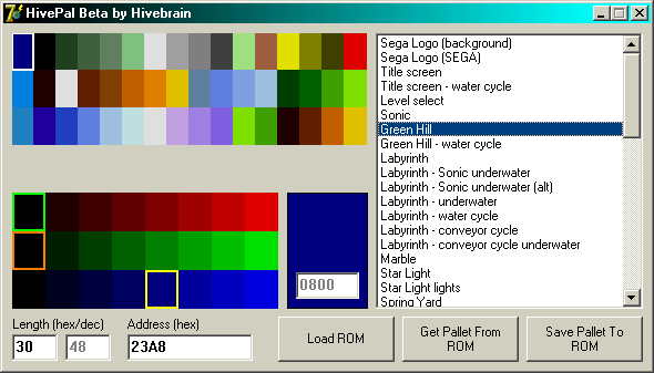 HivePal is a Mega Drive palette editor written by Hivebrain in Delphi. It can edit both ROMs and separate palette files (such as those found in disassemblies) with an easy-to-use color menu. HivePal also includes a palette browser, which can be used to visually search for palettes in a ROM. The browser is incomplete and has a number of minor bugs.Reviews