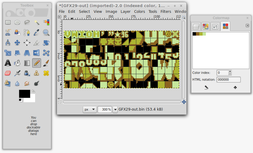 Image size: ROMs and tile files that are not an even multiple of tile width will get padded with transparent pixels at the end of the image, and have any trailing data stored as gimp image metadata. The plugin will attempt to preserve original file size and integrity as much as possible. Setting transparent pixels (in tiles) at the end of the image to non-transparent will cause those tiles to get written to the file and therefore increase the file size. Be careful.