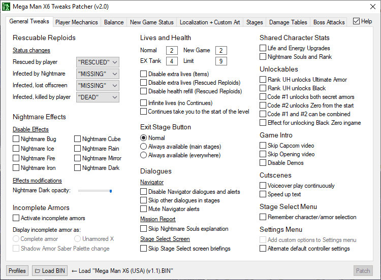 This utility is an offshoot of the Mega Man X6 Tweaks hack, which adds a slew of improvements to the game. The patcher, however, allows you to choose which of these improvements (and a few more) you would like to patch. This allows for way more customization compared to the Tweaks hack, something I wholeheartedly applaud.