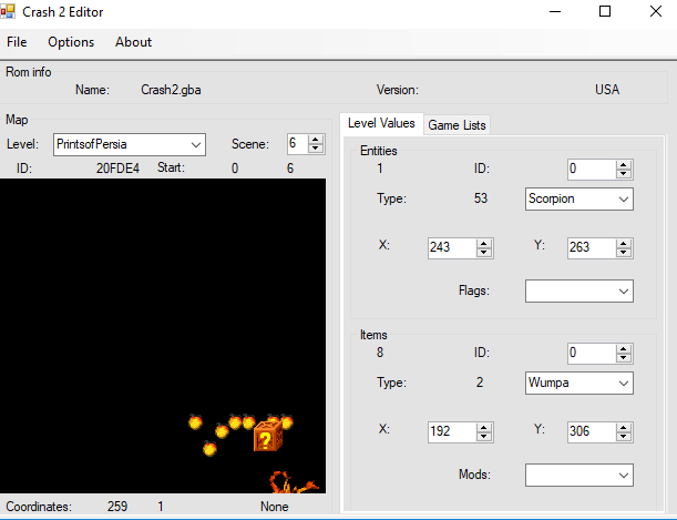 Crash 2 level editor allow to edit items and enemies for each game level, and change some properties for those, also allow to save rom as backup.Reviews