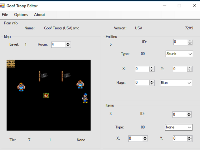 Goof Troop level editor allow to edit items and enemies for each game level, and change some properties for those, also allow to save rom as backup.Reviews
