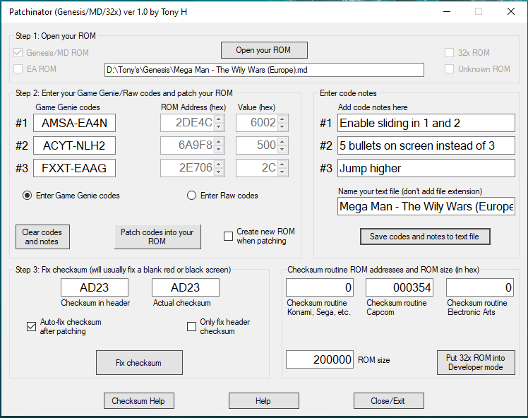 Update to version 1.0 (2/9/2023). Improvements: Can patch 3 codes at once now, can type in your own notes for each of the codes and click a button to save them to a text file along with the codes, addresses, values, and other useful info so you can remember what codes you patched into your ROMs, can now enter your own ROM addresses and values (instead of just entering Game Genie codes), gives warnings when you use odd numbered ROM addresses since ROM addresses should be even numbers, has much better checksum fixing now including Electronic Arts, Konami, Sega, Capcom, and others, can "Auto-fix" checksums after patching if you'd like, has an option to create a new ROM when patching, shows the size of the ROM and limits the ROM addresses you can enter based on the ROM size, can now patch ROMs up to 14.6 MB (Demons of Asteborg ROM), program no longer uses a separate dll file, shows ROM addresses of any checksum routines it finds (Konami, Sega, Capcom, Electronic Arts, etc), has an option to put 32x ROMs into a developer mode, and many other improvements.