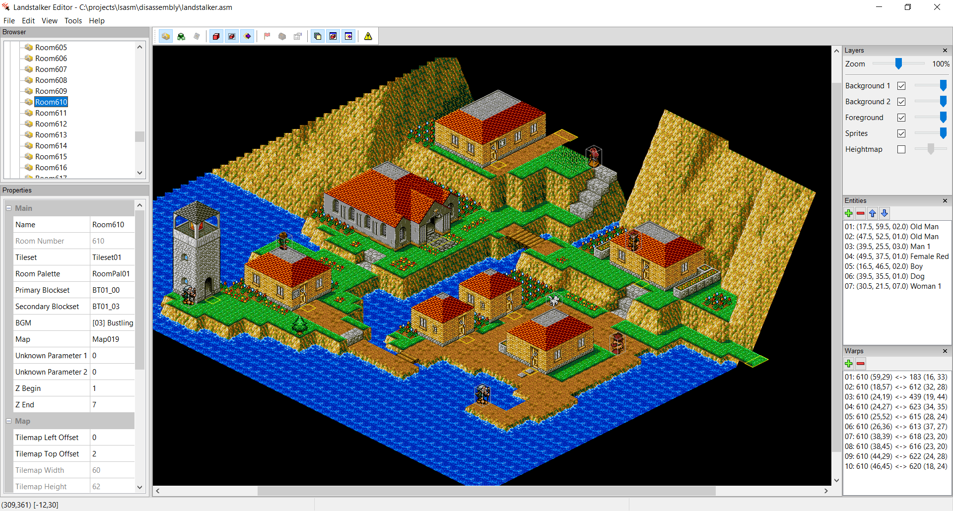 - Integration with the Landstalker Disassembly v0.2, including automatic assembly generation.