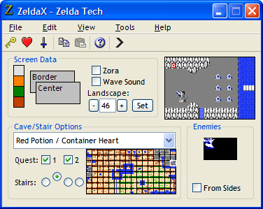 Zelda Tech is an overworld editor for the Legend of Zelda. In addition to basic screen editing it includes a shop editor, a string editor, mapping utilities (including cave maps), provisions to create a functional second quest, and much more.Reviews