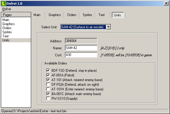 Eisfrei is a ROM editor for Herzog Zwei. It has a mostly-friendly interface that makes editing incredibly easy. No messing with hex editors, decoding values, or any of that. If you can click and type then you can hack away to your heart's contentment.Reviews