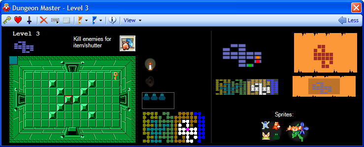 Dungeon Master is a dungeon editor for the original Legend of Zelda game. This editor, combined with the "Zelda Tech" over-world editor, provides all the tools necessary to perform a complete, comprehensive hack of Zelda (including a second quest if you so desire).Reviews