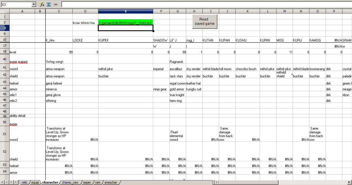 A simple MS Excel file (need enable macro) to view basic detail of characters , weapons, armors , relics ,esper that were equipped, from a SRAM file save by SNES9X.Reviews